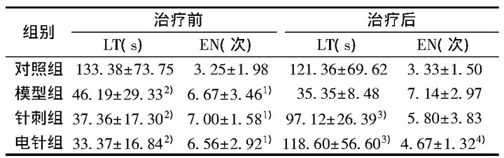 表1 各組小鼠治療前后避暗試驗(yàn)LT及EN比較(±s,n=10)
